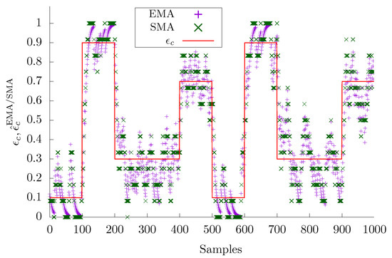 By resorting to simulation, the performance of SMA and EMA was evaluated for a specific variation pattern. For simplicity, we modeled channel c for a given link using four states, characterized by equal to , , , and , respectively. Transitions between states, in this order, took place every 100 transmission attempts on that channel. As an exception, the system stayed in the third state, corresponding to , for 200 attempts. In other words, in the simulations we modeled as a specific piecewise constant function. Assuming , , = 20 ms, and that a pending frame is always ready to be sent, implies that attempts on any channel c (and hence, samples describing their outcomes) are spaced by about 32 s. This means that in the above sample disturbance pattern, the time that the environment remained (mostly) stable between subsequent variations was at least 50 min. Realistically, the spectrum can be satisfactorily described by referring to the cyclicity of human activities over the day (morning, afternoon, evening, and night), which are characterized by slower dynamics (several hours).