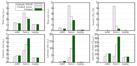 The metrics defined above for steady-state analysis were evaluated again to compare TSCH and the two choking mechanisms (with and without normalization). In the latter cases, the choking mechanism was driven either by the real failure probability (the same we used to generate the outcomes of attempts, modeled as Bernoulli trials) or by the probability estimated by applying a low-pass filter on past outcomes. In particular, we opted again for the use of EMA by setting . Results obtained when ACCS was driven directly by values (and not by estimates) can be seen as benchmarks. In fact, doing so permitted to prevent the effects due to estimation errors (both jitters and slowness in tracking the failure probability in dynamical varying environments), which negatively affect ACCS behavior.
