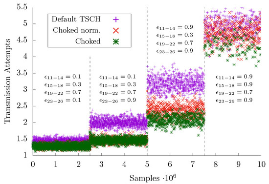 As can be seen in the middle part, where disturbance is objectively heavy, conventional TSCH features the shortest latency. However, more than three attempts per frame are performed on average in these conditions, which implies that the power consumption on the transmitter side is three times higher than when there is no disturbance at all (so that transmissions always succeed at the initial attempt). Reliability is only partially satisfactory, as of the frames are lost.