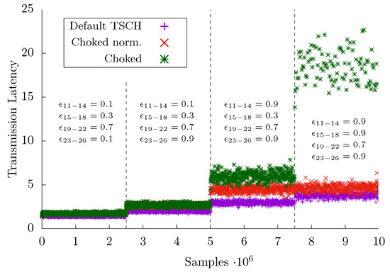 The second metric we took into account is the transmission latency, denoted , which is defined only for those frames that were successfully delivered to destination. A relevant contribution to the latency is the number of retries made to deliver the frame, which equals . In fact, on every retry the latency increases by one slotframe . Actually, when choking is active, also the skipped cells must be taken into account, whose number for frame j is denoted . Every frame transmission is additionally affected by a waiting time, due to the fact that slotframe repetition and actual sampling are typically not synchronized. Its contribution to the overall delay is not fixed, but is always upper bounded by the slotframe duration and, on average, it amounts to [14]. We neglected delays due the communication stack in both the receiver and the transmitter, as well as propagation delays for signals over the air, because they do not depend on the communication protocol.
