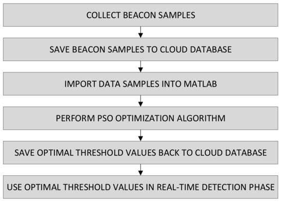 The optimization process is presented graphically in Figure 6. First, a PSO test population (swarm) is initialized. In the initial population, particles are initialized randomly, with values between [min, max]. Next, all measurements of the specific beacon are processed using a measured data filter, with the value of the test individual contained in the population. If the average of the last three measurements of a single beacon is higher than or equal to, the set measured data filter threshold, it is ready for the next phase of filtering. In the second phase, raw values are first processed using the measured data filter, followed by a simple moving average (SMA) filter with five samples (Equation (7)).