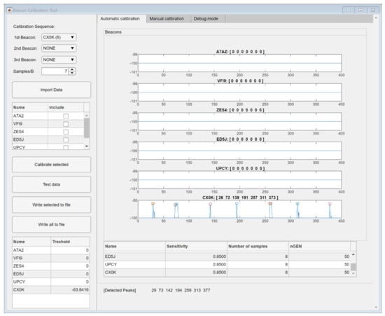 Due to the number of PSO evaluations used in the process of optimization for each beacon (), the optimal threshold value is calculated on the PC instead of Raspberry Pi. Namely, for each separate beacon, a calibration must be performed to ensure optimal detection and false positives’ rejection. The calibration process takes place in a MATLAB App Designer-developed app, which guides the user visually through the entire calibration process (Figure 5). The app graphical user interface (GUI) is user friendly, intuitive, and the calibration process is almost entirely automatic. However, due to the fluctuations of measurements, sometimes the thresholds should be finely adjusted manually by the user. Of course, before the system is used in a final application, the thresholds must be validated accordingly.