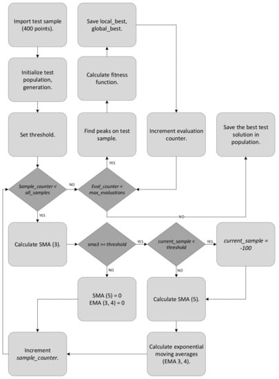 The algorithm running on Raspberry Pi is divided into three categories: (1) detection, (2) signal processing, and (3) data evaluation and posting. As can be noted from Figure 7, several steps in the calibration/PSO optimization process are identical, so that the calibration and real-time detection phases should return the same results.