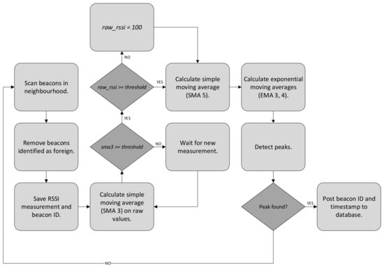 The system’s main component, Raspberry Pi, attached to the person, scans the nearby surroundings for any present beacon with a predefined MAC address. After the scan cycle has been completed, the system first filters out measurements which returned the value ‘None’ and replaces them with a fixed negative number (−100). All beacons which are not recognized by the system are eliminated automatically and have no effect on measurements. Next, the measurements of each beacon are processed using the measured data filter with their corresponding threshold, set in the calibration phase. If the average of the last three measurements of a processed beacon is higher or equal to the set measured data filter threshold, we assume that the person carrying the receiver is in the vicinity of a beacon and is ready for the next phase of filtering. In the second phase, thresholded values are processed with a simple moving average (SMA) filter (Equation (7)) with five samples, followed by an EMA filter calculation (Equation (8)). Values first processed with SMA are processed further with the EMA filter with a window size of w1 = 3, and secondly with a window size of w2 = 4, but not sequentially. Similarly to the calibration process, for a peak to be detected in the processed measurements, three conditions must be met: