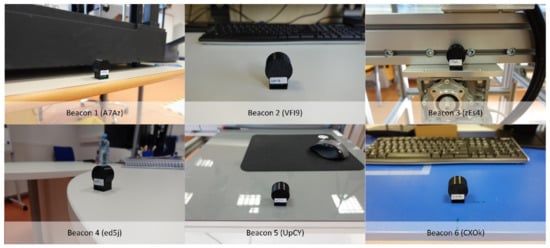 In our experiments, six BLE beacons Smart Beacon SB16-2 were used, shown in Figure 1. The original batteries were replaced with a single cell CR2477 battery, and the PCB was placed in a smaller 3D-printed case to reduce size further. The Smart Beacon SB16-2 specification is presented in Table 1.