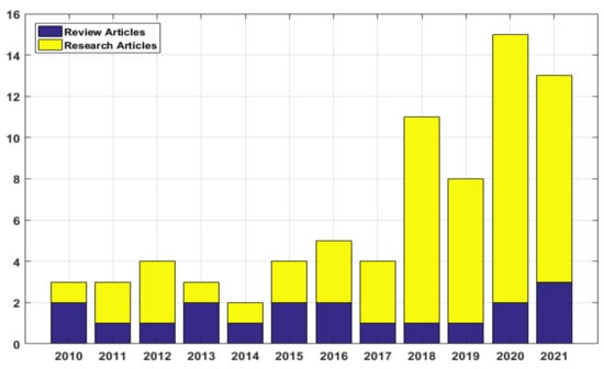 Figure 2. Number of selected research articles and review articles per year from 2010 to 2021.