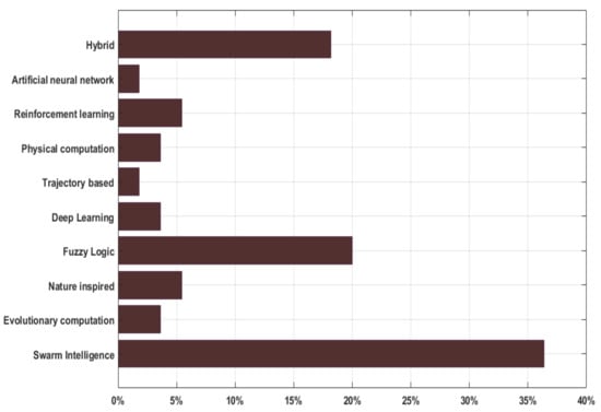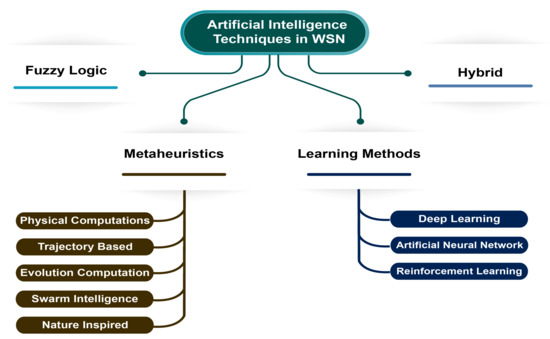 AI refers to a computer system’s ability to accomplish activities that need human intelligence while imitating human minds or ideas. It is considered as one of the important area of computer science that tries to make machine “smart”. The most widely used techniques of AI include: search methods, learning methods, fuzzy system, knowledge based and reasoning. AI is applicable to resolve many complex concerns in various sectors such as security, finance, health care, transportation and so on, through its ability in handling deficient and noisy data, dealing with non-linear issues, and are suitable for use in prediction and faster generalization once trained []. We have studied and classified various AI techniques used in WSN as depicted in Figure 3. Different AI techniques used in addressing WSN challenges include Fuzzy Logic, Artificial Neural Network, Evolutionary Computation, Nature-inspired, Multi-Agent Systems, Trajectory based, Physical Computation, Swarm Intelligence, Deep Learning, Reinforcement Learning and Hybrid. An overview of these techniques is presented as follows.