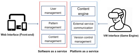 A web platform is a useful tool for teachers where they can make VLEs for students without knowing how computer graphics work and using a web browser application. In comparison to the client application, the web platform provides more flexibility regarding content creation. The software design of the web platform component is shown in Figure 3. The web platform provides a SaaS solution for building a virtual environment or VWs. The pattern management component is used to control the available features within each of the templates and provide associated components that are applicable in that context. The user management component is used to provide functionality for the provisioning of users and associated access rights according to the selected package. The content management module is devoted to handling all the content used within the platform such as 2D, 3D models, audio, and video files. Cloud PaaS provides the cloud infrastructure for the environment executed in the VWs. The content engine offers the framework for the management of all the media content, including the 2D and 3D models, sound, and video material. The version control management provides functionality for version control so that the developed VWs can be upgraded to the newest version and synchronized with already deployed VWs. The external service communication enables interfaces to services outside of the infrastructure. For building a web platform, we used web-based technologies such as JavaScript (three.js 3D library) on the front-end side and PHP with MySQL on the backend.