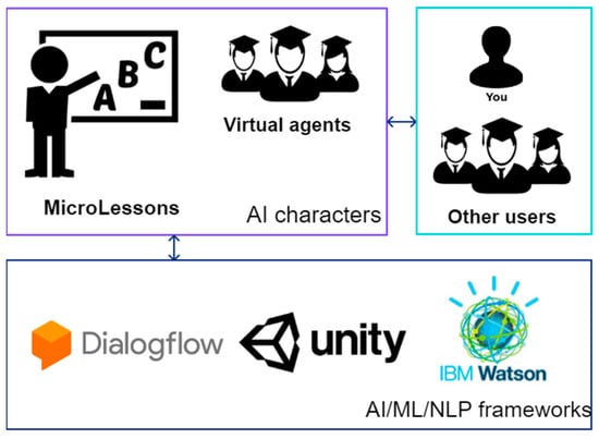 User experience inside VWs can be improved using intelligent agents (virtual assistants or chatbots). Supported by AI, a chatbot or a virtual assistant recognizes the content and understands what it means in a specific context that can be in the form of text, voice, or both. They can utilize information from different sources, using natural language processing (NLP) tools with real-time insights such as Microsoft LUIS, IBM Watson, Amazon Lex, Google Dialogflow, and more. Virtual assistants can increase productivity and automate the process, especially in industries such as education that rely on communication and handle a set of student issues and questions. We designed a component for developing NPCs inside the virtual environment (Figure 4). Based on software architecture, we can use multiple machine learning frameworks that enable us to add intelligent features such as emotion and video detection, speech and vision recognition, and language understanding of our platform. The intelligent agent component is used to enable the cognitive feature to Professor Vortex NPC that we use for tutoring VW users.