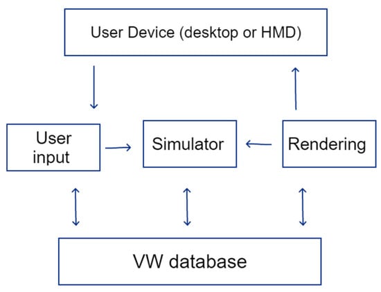 We can use the term virtual reality learning environment (VRLE) in the case where we use VR HMD. The proposed architecture should be adaptable for VR and other extended reality technologies such as augmented or mixed reality. We use a non-immersive and XR system to build the user interface (Figure 5). The system uses input processor controls to send information to the device (mouse or HMD trackers) in a compressed time frame. The simulation module represents the business logic of a VR system. It takes the user input and determines the actions inside the VW. The rendering module creates a 3D graphical environment for the end-user. Different rendering techniques are used for haptic or HMD devices. The VR environment also has a database that stores the objects from VWs.