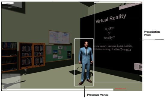Warburton considered multi-user (networking) VWs as a new trend in the field of e-learning using the Second Life platform []. A VW was used to motivate students in conjunction with the e-learning software platform Moodle. An integration example of Moodle to the Second Life platform was Sloodle (Simulation Linked Object-Oriented Dynamic Learning) learning system for virtual environments []. Sloodle is an open-source solution that integrates the multi-user virtual environment Second Life and OpenSim with the Moodle learning management system (LMS). Sloodle establishes communication and interaction between the objects in Second Life and the materials that are downloaded from Moodle. Furthermore, Sloodle is used by hundreds of teachers and students around the world. Nunes et al. [] have published research regarding Sloodle. In the paper, they introduced the main characteristics and evaluated the effectiveness of supporting tools in the teaching of algorithms in an engineering course. The solutions used in this research were OpenSim, Moodle, online software IDEOne for the algorithm exposure, and Sloodle. The analysis confirmed that the combination of a VW with Moodle is a valid alternative to the process of teaching, motivating, and stimulating immersion during student activities. Sloodle is currently the most well-known e-learning platform for VW-based education and solution that influences the development of the VoRtex prototype.
