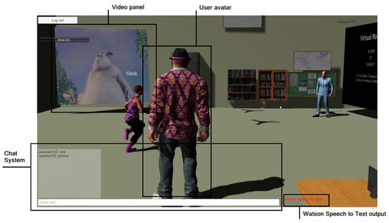The VoRtex prototype contains a VW classroom (Figure 8) or MicroLesson with 3D material that supports learning in a real-life environment. The VW classroom contains a table, chairs, a blackboard, projectors, a video and presentation panel, and a virtual agent that assists the teacher during lectures. The users can interact with the intelligent agent using voice controls. Speech recognition (speech to text) software takes the user’s voice as input and determines which words were spoken as output that typically consists of a word graph. Based on the generated output, the event executes inside the VW. We use IBM Watson services in the Unity game engine. IBM Watson allows us to transform the client application into environments where the users and agents can interact using text-to-speech and speech-to-text services. The users can communicate using the chat system (bottom left in Figure 7). We implement a chat system as a separate component with the goal of high reliability and availability in a networking system and to avoid a single point of failure. This means that if a session stops, then we can use the chat system to check with other users what measures to take to fix the issue. The teacher cannot modify MicroLesson in the prototype version using the web platform via a web browser or the client application. We plan to include the web platform in a future version of the prototype.