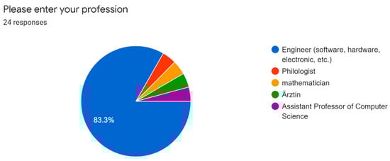 Regarding participant background (Figure 9), most of them were software engineers (15), telecommunication engineers (2), electronic engineers (1), and assistant professors (3), while the rest were mathematicians (1), specialist doctors (1), and philologists (1). The results were organized in percentage charts and provided below.