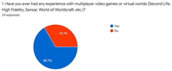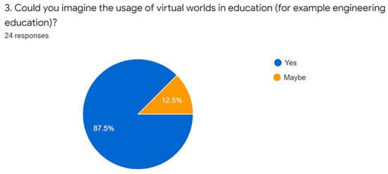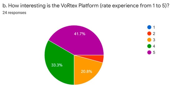 The VoRtex prototype for Windows PC was demonstrated and tested mostly on users (participants) that attended engineering institutions as students or teaching assistants with experience in the e-learning and gamification process. In the survey, we included 24 users where 70% had experience in VW platforms such as Fortnite or multiplayer video games. More than 80% of participants had an engineering background and work in the industry or education sector. The prototype demonstrated the MicroLesson about VR and 3D technologies in a computer-generated classroom. Before the users accessed the environment, they created a login account and chose digital avatars that would represent them in a VW. Using the client-server networking system, the teacher created a server, and after, those students accessed the session as clients. The teacher that hosted the session had the privilege to allow them to manipulate VW content such as a video and presentation panel, where the users could change the presentation slides that were synchronized with the server and all clients during the session. Furthermore, the users could communicate over the chat system and ask a virtual agent (Professor Vortex) about their subjects of interest. Using the networking system, the users could synchronize with each author and follow what other participants were doing during the session. After testing the prototype, the users needed to answer a questionnaire provided by Google Forms. The survey consisted of a few questions regarding VW platforms, user experience, advantages and disadvantages for collaborative learning, and development potential of the following engineering education skills: