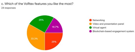 Participants praised the networking and the presentation panel implemented in the VoRtex platform (Figure 14). Using the networking system, they could contact the teacher or other students without disturbing another participant inside the session. Both features are developed for educational purposes to simplify communication between students and teachers or multiple students.
