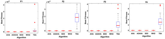 Table 1, Table 2 and Table 3 show the statistical results of the AOAHA and other recent algorithms when applied for the unimodal benchmark functions, multimodal benchmark functions, and composite benchmark functions, respectively. The best values were achieved with the AOAHA, AHA, SDO, WHO, and TSA algorithms, as shown in bold. It can clearly be seen that the AOAHA technique attains the best solutions for most of these benchmark functions. The convergence curves of these algorithms for these functions are presented in Figure 6, while the boxplots for each algorithm for these functions are presented in Figure 7. From those figures, it is clear that the AOAHA algorithm reaches a stable point for all functions, and the boxplots of the AOAHA algorithm are very narrow and stable for most functions compared to the other algorithms.