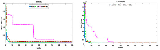 As for the application of optimization algorithms to obtain an accurate PV model, many previous studies have been carried out for this purpose [20]. The rapid development of population-based optimization algorithms has enhanced this research area, due to their being meta-heuristic and derivative-free algorithms, unlike greedy algorithms—which solve problems locally in each step, thus depending on finding the best solution in each step based on the previous step—and convex algorithms (e.g., gradient descent algorithms) that depend on the convex function. Therefore, population-based algorithms are suitable for complex and nonlinear functions such as the objective functions of PV models [20,21]. The main challenge in the estimation of PV models’ parameters is the nonlinear characteristics of the PV systems, requiring a robust optimization algorithm for this optimization problem. A review of the recent work in this area was presented in [21]. In this study, a collection of recent work on the estimation of PV parameters is discussed. Approximately 29 optimization algorithms are reviewed, such as ABC, MPSO, SSA, and ITLBO. In each reference, the main points discussed are the PV model type, the different applications and case studies proposed, the evaluation methods, and the obtained results. The TDM has seen many applications in the literature, due to its efficiency in representing PV modules such as polycrystalline MSX-60, monocrystalline CS6K-280M and multicrystalline KC200GT. Some studies have applied optimization algorithms to estimate all nine parameters of the TDM, while others tried to estimate two parameters analytically and the rest using optimization algorithms [22]. In this work, the proposed optimization algorithm was used to estimate all nine parameters of the TDM, in order to check and compare its performance with other optimization algorithms through such complex problems.