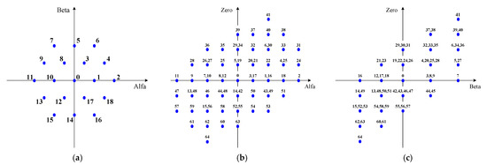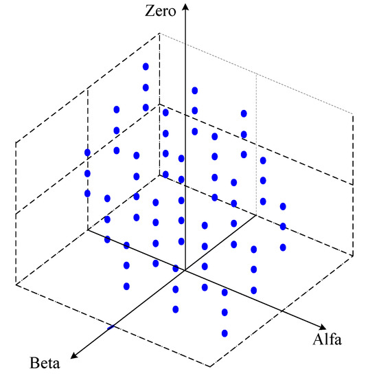 From the analysis of Equation (3), considering all possible combinations of the switches and that the DC voltages are equal, a total number of 256 space vectors are obtained. However, not all of these vectors are different. In fact, only 65 voltage vectors (including the zero voltage) are different, with the others being redundant. Figure 3 shows these different voltage vectors in a three-dimensional space (αβo coordinates), which can be applied at the output of the proposed converter. On the other hand, from the 65 different voltage vectors, 19 vectors are related to the two-dimensional αβ plane (Figure 4a), 49 are related to the two-dimensional αo plane (Figure 4b) and 25 are related to the two-dimensional βo plane (Figure 4c).