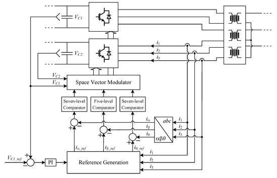For the other inverter, there is no need to control it in a similar way, since the AC currents of one of the inverters are the same as in the other. The control of the capacitor voltage VC2 is obtained through the right choice of voltage vector to be applied to the inverters. As can be verified in Table 1, Table 2 and Table 3, there are redundant vectors. Therefore, since some of them charge one of the capacitors and discharge the other one, and vice versa, the correct choice maintains the voltage of capacitor C2 as equal to the voltage of capacitor C1. For example, considering the previous case in which να = +2, νβ = +1 and νo = +1, then vectors 4 and 20 can be applied. On the other hand, associated with these two vectors are redundant combinations, as can be seen in Table 4. Therefore, if capacitor voltage VC1 is higher than capacitor voltage VC2 and the current of phase 1 is positive and the other ones are negative, then vector 20E must be applied, since it will discharge capacitor C1 and charge capacitor C2. For the reverse situation, in which the capacitor voltage VC1 is lower than capacitor voltage VC2, then vector 20D should be chosen. The balance between the two capacitors is granted. The complete control scheme of the proposed multilevel inverter can be seen in Figure 5. This control scheme consists of the DC voltage controller, AC current controller and space vector modulator.