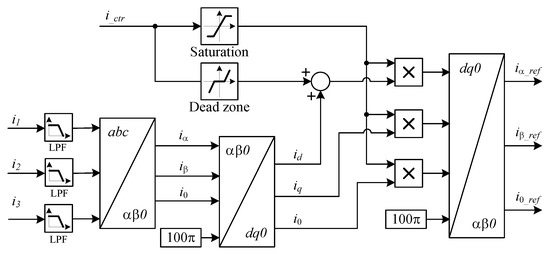 If the loads are non-linear and it is only desired to compensate for the active power or active and reactive power imbalances associated with the load, the scheme should be changed. The generated harmonics will be reflected in the dqo currents as AC components. Thus, to avoid the compensation of the harmonics by the PV inverter (to prevent oversizing the inverter), these AC components should be removed. However, these components will introduce a new problem, since some of them are at the near frequency of the AC components generated by the imbalance of the linear loads. To avoid this problem, the acquired load currents are filtered with a low-pass filter before the Clark–Concordia transform is applied. The new scheme that only compensates for the active and reactive power imbalances of the load is presented in Figure 8. If it is desired only to compensate for the active power, then the AC components of the q current component should be removed.