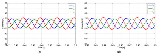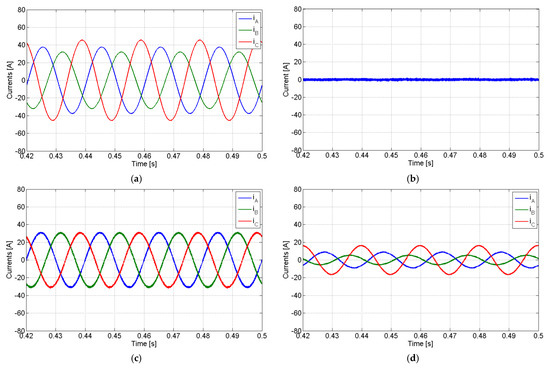 Simulation results with the PV generator operating in balanced mode with a linear load: (a) load currents; (b) current in the line between the fourth leg of the inverters; (c) AC currents of the PV generator; (d) grid currents.