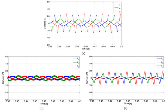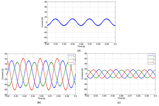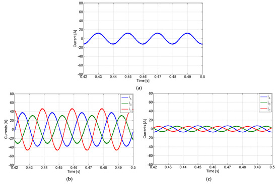 Simulation results with the PV generator in subcompensation mode with a non-linear load and compensation of the active power imbalance: (a) AC currents of the PV generator; (b) load currents; (c) grid currents.