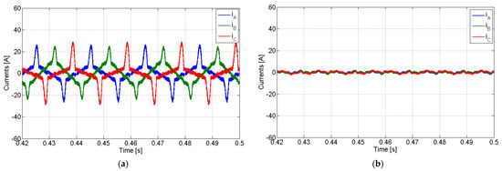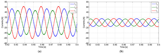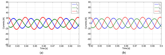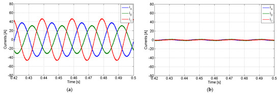 Simulation results with the PV generator in full compensation mode with a linear load and compensation of the active and reactive power imbalances: (a) AC currents of the PV generator; (b) grid currents.