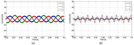 Simulation results with the PV generator in subcompensation mode with a non-linear load and for compensation of the reactive power and harmonics: (a) AC currents of the PV generator; (b) grid currents.