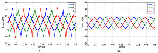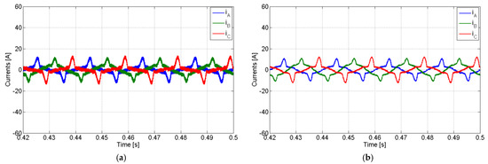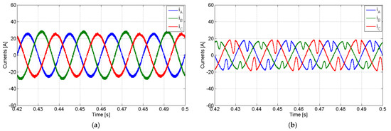 Simulation results with the PV generator in full compensation mode with a non-linear load and for compensation of the reactive power and harmonics: (a) AC currents of the PV generator; (b) grid currents.