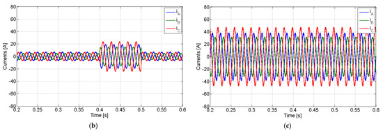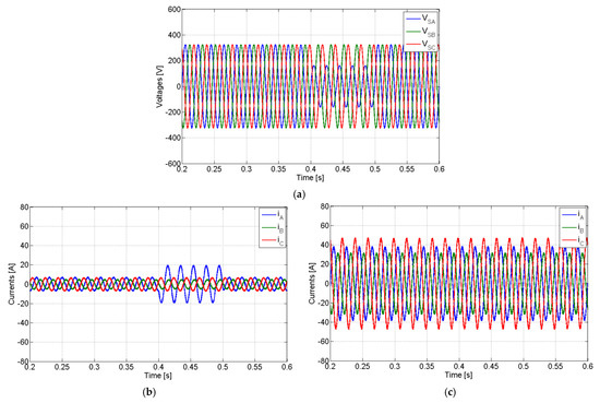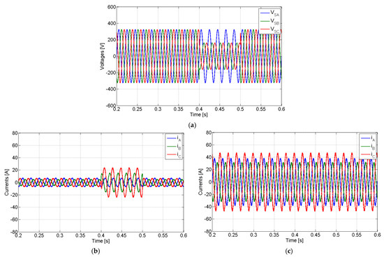 Simulation results for a three-phase fault using a non-linear load and compensation of the active power imbalance: (a) grid voltages; (b) grid currents; (c) AC currents of the PV generator.