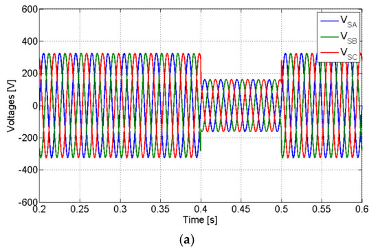 The performance of the system in response to several types of faults in the low-voltage grid was also assessed. A first test in which a phase-to-ground fault in the PV generator in subcompensation mode with a linear load and compensation of the active power imbalance was performed. This type of fault affects the voltage of the line under fault, namely with a reduction in its amplitude. In Figure 23, the obtained results for a fault of this type in phase A are shown. The fault occurs from 0.4 s to 0.5 s, whereby the voltage amplitude of that phase is reduced by 50%. Due to the fact that the load is linear, the amplitude of the current associated with the faulty phase is also reduced. However, the PV generator is not affected, since it keeps the power injected into the grid. In the grid current associated with the faulty phase, it is possible to verify that during the fault, there is a phase inversion because the load current of that phase reduces and the PV current is kept. Another test was performed, although in this case for a phase-to-phase fault in phases B and C. This fault affects the voltages in phases B and C, namely with a reduction of 50 % (Figure 24a), meaning there are two phases that are affected, which can be seen from the grid currents presented in Figure 24c. The power injected by the PV generator is not affected (Figure 24b). A test for the three-phase fault was also performed. The obtained results are presented in Figure 25. As expected, now the fault affects all phases. Since the power injected by the PV generator is maintained during the fault, there are increases in grid current amplitude and phase inversion for all phases.