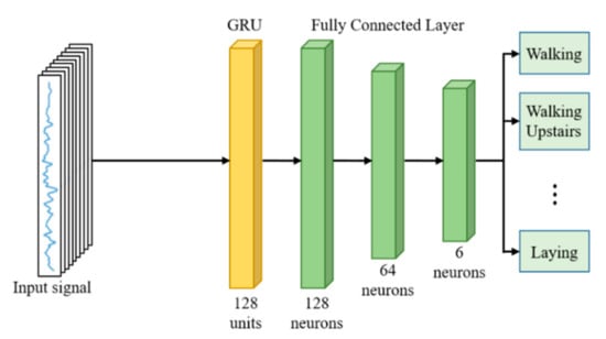 Figure 1 shows the structure of the GRU model, where the GRU used to extract the features of sensor signal is with unit number of 128 and batch size of 32. The control reset gate and update gate use sigmoid function, and hidden state uses tanh function. The fully connected layer consists of three layers which is used to classify the activities. The three layers have dimension of 128, 64, and 6, respectively. The activation functions are respectively ReLU in hidden layers and sofmax in the output layer. The Adam optimizer is used with a learning rate of 0.0001. The objective function is Categorical Cross-Entropy function: