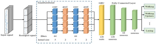 Because human activities are chronologically ordered, the sensor signals are time-series data. A time-distributed layer consisting of four CNN, i.e., two pairs of 1D convolutional network and maximal pool layer, is stacked on the GRU. Thus, a sample was separated into four segments and each segment contained 32 points. Figure 2 shows the structure of stacking CNN + GRU model. In the convolutional layer, the number of filters is 64, kernel size is 5, stride is 1, and padding is 4. In the polling layer, the kernel size is 2 and strike is 2. The activation function is ReLU. The unit number of GRU is 128. Batch size is 32. The control reset gate and update gate use sigmoid function, and hidden state uses tanh function. The stacking CNN + GRU is used to extract the features of sensor signals. The fully connected layer comprised of three layers, is employed to classify the activities. The numbers of neurons of the three layers are 128, 64, and 6, respectively. The activation functions are ReLU in hidden layers and softmax in output layer. The objective function is Categorical Cross-Entropy function, the Adam optimizer is used, and the learning rate is 0.0001. Table 6 shows the setting of the stacking CNN + GRU model.