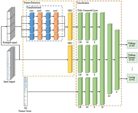 Figure 3 shows the full structure of the proposed ELA model, which performs the recognition task with three branches. In the top branch, the features of sensor data are extracted by the stacking CNN + GRU. Then the extracted features are inputted to the fully connected layer. In the middle branch, the data features extracted by the GRU are sent to the fully connected layer. In the bottom branch the 561 time-domain and frequency-domain parameters (feature vector) obtained from raw sensor data are directly sent to the three layers of DNN in which the neuron numbers are 128, 64, and 6, respectively. These layers could be considered as the multilayer neural network which has two hidden layers and an output layer to classify the six activities. Then, the outputs of 3 branches are fused and sent to the full connected DNN with three layers for the activity classification. The number of neurons in each layer of the fully connected layer are 18, 10, and 6 respectively. The details of GRU and stacking CNN + GRU are illustrated in Section 2.4 and Section 2.5. The activation functions are ReLU in hidden layers and sofmax in output layer. The objective function is Categorical Cross-Entropy function, the Adam optimizer is used, and the learning rate is 0.0001.