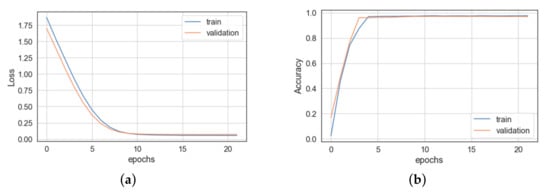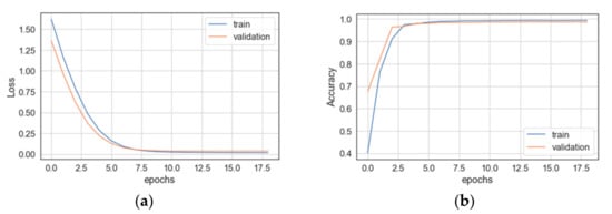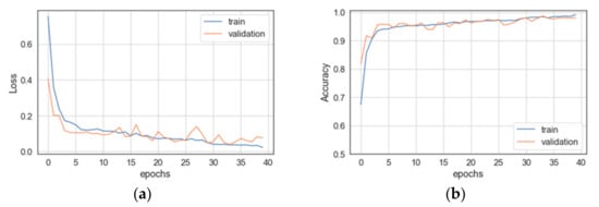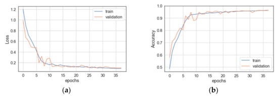 Training and validation curves of stacking CNN + GRU model, (a) Loss functions in training (blue line) and validation (orange line), (b) accuracies obtained in training (blue line) and validation (orange line).