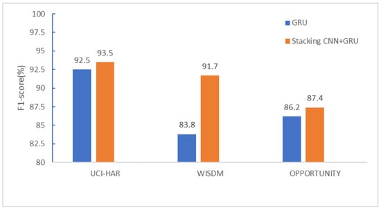 In order to further verify the effectiveness of the models employed in this study, the WISDM and OPPORTUNITY datasets were also employed. Since the WISDM and OPPORTUNITY datasets do not support the 561 time-domain and frequency-domain parameters, the proposed ELA model was not applied in the experiment, and therefore only the GRU and stacking CNN + GRU were used for performance evaluation. Figure 8 illustrates the F1-score of the GUR and stacking CNN + GRU models employing UCI-HAR, WISDM and OPPORTUNITY datasets. The F1-score of the GRU and stacking CNN + GRU models based on the WISDM and OPPTUNITY datasets are 83.8% and 86.2%, and 91.7% and 87.4%, respectively, which are lower than those with HCI-HAR dataset.