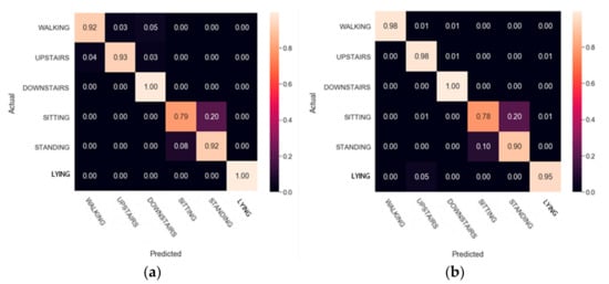 Figure 6 shows the training and validation curves of the proposed ELA model which only combines GRU and stacking CNN + GRU. The obtained loss functions in training (blue line) and validation (orange line) are exhibited in Figure 6a, and the attained accuracies in training (blue line) and validation (orange line) are illustrated in Figure 6b. The accuracy achieved the best when epoch equals 10. Table 9 shows performance of the ELA model without the 561 parameters which fused the outputs of three branches for activity classification. The average precision, recall, F1-score, and accuracy are 93.5%, 93.6%, 93.5%, and 93.4%, respectively. However, the performances of ELA without 561 parameters for recognizing the sitting and standing activities do not have the significant raise.
