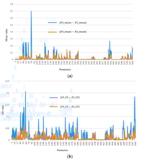 The feature differences of mean and standard division (SD) between training and testing data of standing and sitting activities introduced by 561 parameters, (a) mean differences of 561 parameters between the training set of standing activity (x4_mean) and the testing set of sitting activity (x5_mean) (blue line), and the mean differences of 561 parameters between the training set (x4_mean) and testing set (x6_mean) of the standing activity (orange line), (b) the SD differences of 561 parameters between the training set of standing activity (x4_SD) and the testing set of sitting activity (x5_SD) (blue line), and the SD differences of 561 parameters between the training set (x4_SD) and testing set (x6_SD) of standing activity (orange line).