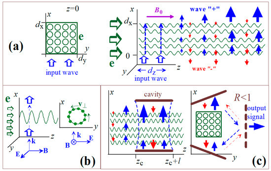 We consider the cyclotron emission from a beam of electrons moving along the axial magnetic field (Figure 1). This is a spatially developed electron beam, whose transverse dimensions and (Figure 1a) are sufficiently large on the scale of the wavelength of the radiated wave. Along with the translational motion along the z-axis, the particles also perform gyro-oscillations in the x–y plane (Figure 1b), and they interact with a plane wave propagating in the positive direction of the x-axis (Figure 1a,b),