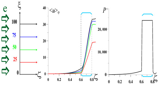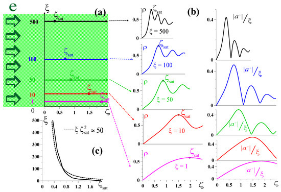 In contrast, if the normalized width of the electron beam becomes large enough (), then most of the electron fractions are bunched almost at the same points of the axial coordinate, . This is due to the fact that the saturated points (the normalized axial coordinates corresponding to the saturation of the electron bunching factors in the electron layer ) become very close to each other for almost all layers of the electron flow. Actually, this can be easily estimated if we add the next terms (with ) to Equation (35):