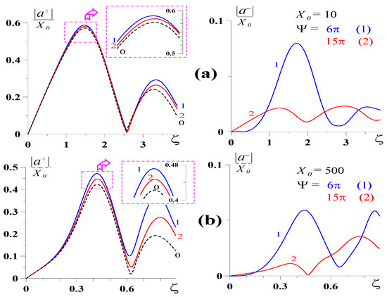 Figure 4 illustrates the effect of the parasitic downstream “−” wave in the cases of electron beams with the normalized widths (Figure 4a) and (Figure 4b). Since the transverse structure of the initial electron bunching is determined by the operating upstream “+” wave, the efficiency of excitation of the “−” wave by such a beam depends on the phase incursion of the parasitic “−” wave with respect to the operating “+” wave. Naturally, if , then both waves are excited by electrons in the same way. The increase in leads to a decrease in the output power of the parasitic “−” wave, as well as to weakening of its effect on the excitation of the “+” wave. Note that the effect of the parasitic downstream “−” wave on the generation of the operating upstream “+” wave is very weak even in the case of relatively small phase incursions (see Figure 4, where corresponds to ). At the same time, the ratio between the peak amplitudes of the downstream and upstream wave beams coming out of the electron beam, , is more than 10% in the case of , whereas in the case of , this ratio decreases down to 3–4%.