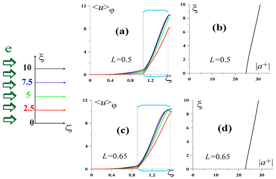 We see that if the normalized width of the beam is relatively small, , then the electron bunching is determined basically by the initial modulation of the electron energy, and the electron bunching factors grow relatively slowly in all layers of the electron flow, such that they reach saturation in the region . If we look at the signal of the operating wave leaving the electron flow from its upper boundary, , we will see that it is extended over the normalized length (Figure 3b, the cases of and 10).