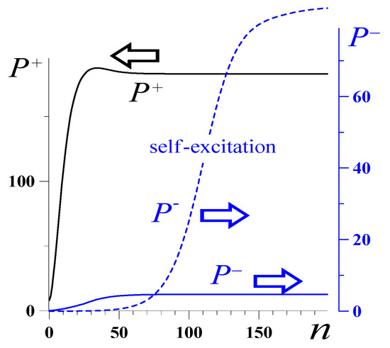 In principle, bunching of electrons in the field of the operating “+” wave can lead also to emission of the “−” wave possessing the same frequency but propagating in the negative direction of the x-axis (Figure 1a),
