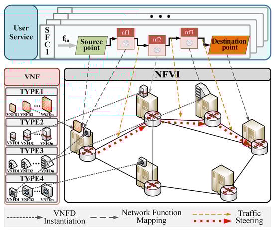 The SFC deployment model in the NFV scenario is shown in Figure 1, which is divided into three layers: network function virtualization infrastructure (NFVI), virtual network function, and user service. Three factors are considered in the model: the selection of instantiation VNFD on NFVI, the mapping of the user network function, and the selection of the traffic steering path. Table 1 summarizes the notations used in this paper.