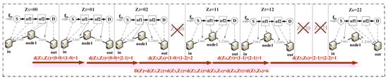 Considering the deployment of SFC on the underlying network , its network function requirements can only be mapped on the routing path set . Because the traffic needs to pass through the network function set in turn, the deployment position of the network function on the underlying link is limited, and this restriction happens to be represented numerically. Define , that is, the number of network functional requirements in the SFC, and is defined as the number of physical nodes passing through the -th path from the source node to the target node. Then the M-Bit N-Base number represents a deployment scheme of on , and the corresponding decision relationship is as follows: