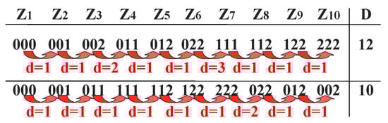 To alleviate the discontinuity of solution space caused by carrying in N-Base coding, the coding sequence of solution space can be rearranged. As shown in Figure 3, the sum of the Manhattan distances of the two arrangements is 12 and 10, respectively (). When the number of and is relatively large (such as , there will be 126 deployment schemes), it is difficult to find the optimal continuity scheme. Inspired by TSP, we take each deployed coding scheme as a city and use the Manhattan distance between deployment coding schemes as the distance between cities. We can model the above continuity optimization problem as an acyclic TSP, and take Equation (20) as the optimization objective, and optimize the problem through the ACO algorithm to obtain the near-optimal continuity [41]. The N-Base coding solution space construction based on the ant colony optimization algorithm (NBACO-SS) is shown in Algorithm 2.