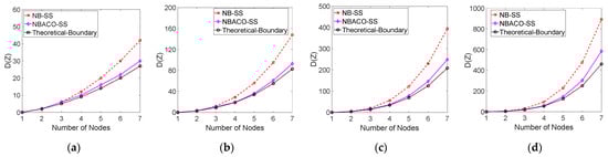 Figure 4 shows that the Manhattan distance continuity of the digital solution space constructed by the NBACO-SS algorithm varies with the length of the user SFC and compares it with the theoretical boundary value calculated by Equation (21) and the NB-SS algorithm without ACO. Note that most of the theoretical boundary values are unreachable according to the Euler Path Theorem, but they can be used as the reference value for algorithm performance evaluation. It can be observed from Figure 4 that the Manhattan distance D(z) increases rapidly with the increase of SFC length and the number of nodes on the routing path. This is because the total number of codes, , is a power function and an exponential function with and , respectively. Therefore, the solution space composed of qualified codes will also increase rapidly, and Manhattan distance will increase accordingly. ACO can greatly improve the continuity of solution space based on NB-SS strategy, especially when the number of NF is less than five and the number of routing nodes is less than six; when the solution space scale is small, and the ant colony algorithm can converge in a faster time, it can approach the theoretical boundary value.