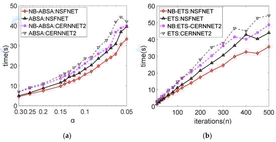 Time efficiency optimization of heuristic SFC deployment algorithm based on NBACO-SS: (a) NB-ABSA; (b) NB-ETS.