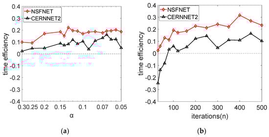 Figure 5 shows the time performance of the heuristic deployment scheme based on NBACO-SS, which is defined as the search time of the algorithm under different iterations. To obtain accurate experimental data, we conducted five experiments at each experimental point and obtained the average results within 80% confidence. The parameter controlling the NB-ABSA algorithm is the cooling rate α. The smaller the α, the slower the temperature reduction and the greater the number of iterations. Figure 5a,b are the simulation results of the NB-ETS algorithm and NB-SBSA algorithm, respectively. We can see that with the deepening of algorithm search time, the proposed NBACO-SS strategy can effectively reduce the simulation time of SFC deployment algorithms. This is because a complete solution space can reduce the repeated search operation, and the coding based on the digital domain can effectively reduce the time efficiency of memory storage, comparison, and search operations of heuristic SFC deployment algorithms. Figure 6 quantifies the time efficiency improvement of our proposed strategy (time efficiency is defined as the ratio of search time improved by the new algorithm to the original algorithm). For two completely different heuristic algorithms, simulated annealing and tabu search, the heuristic deployment scheme based on NBACO-SS can improve the time efficiency by about 20%.