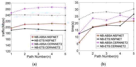 The total network service traffic and algorithm convergence time vary with the number of routing paths: (a) traffic; (b) time.